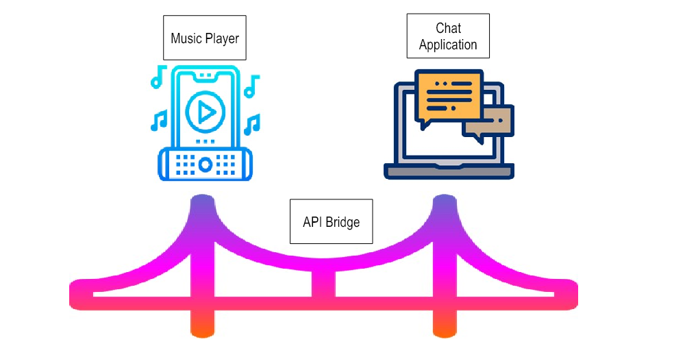 An API is like a bridge between these two programs. You may consider an API that provides a common platform for the applications. It's a set of rules and instructions that tell the music player and the chat app how to talk to each other.