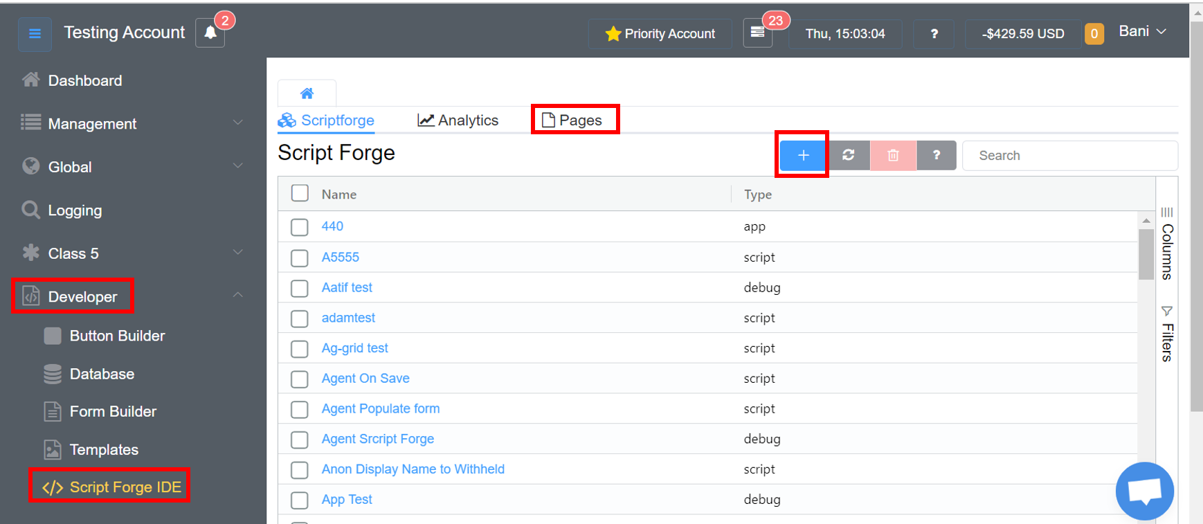 - Go to Developer > Script Forge IDE > Pages.
