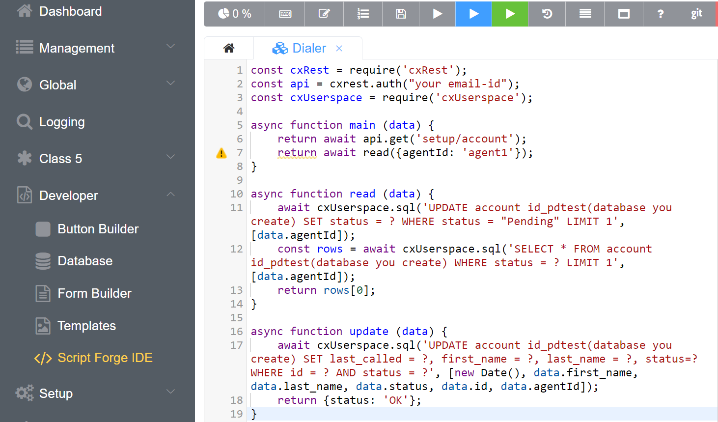 +sign to add the code for Reading and Updating the customer database. - You can add your code script here. Refer to our ScriptForge documentation for additional information. The script we have created is Dialer.