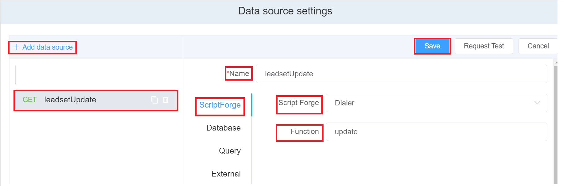 - Again Click on Add data source and rename it to leadsetUpdate.
