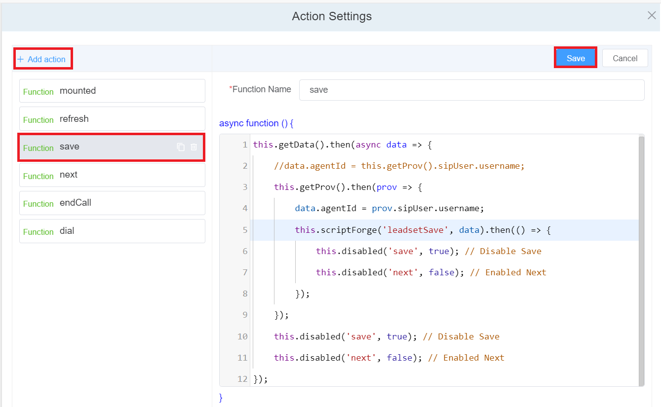 - After refreshing the page, click on the created Dialer script, add the code and