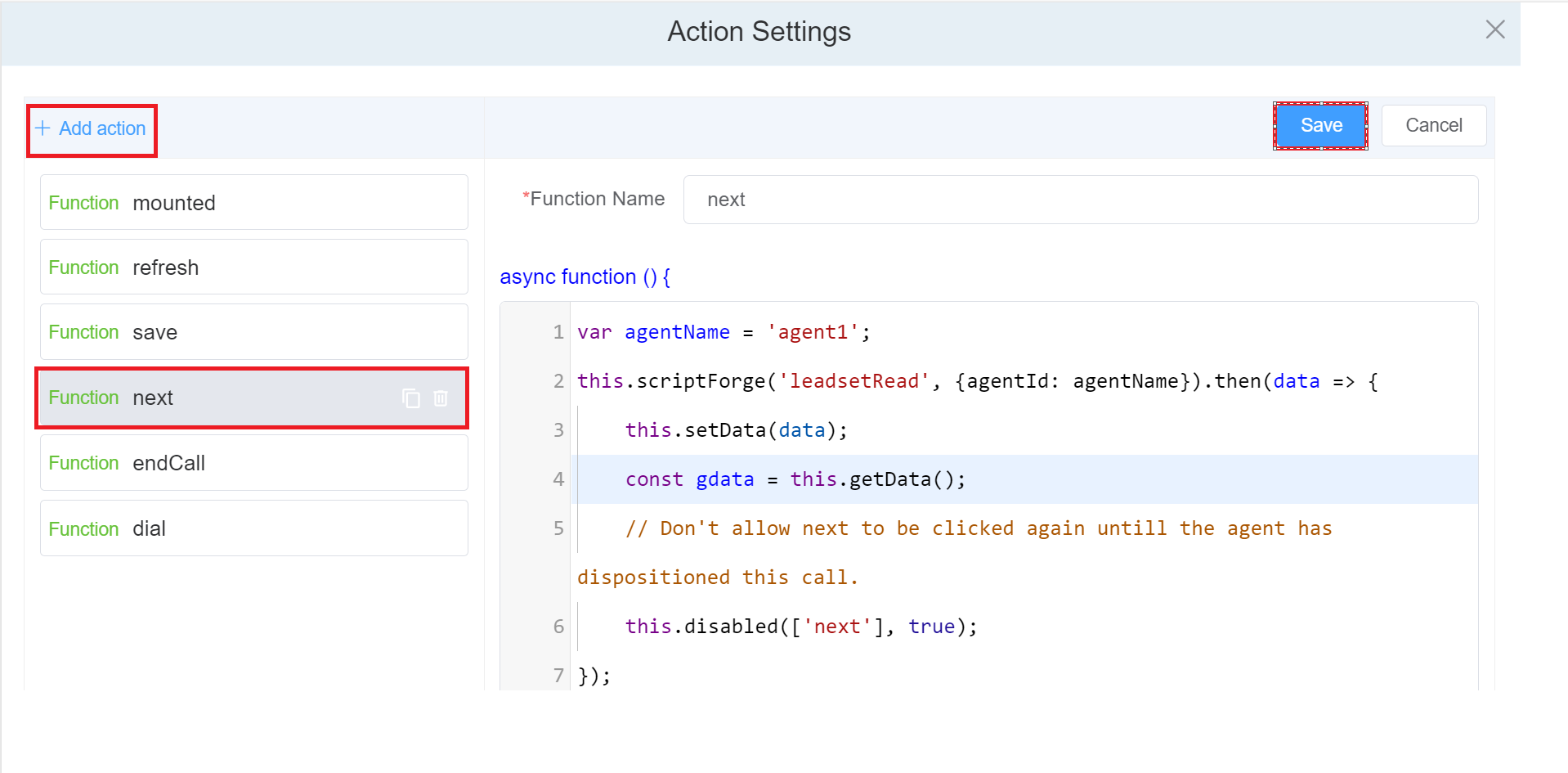 - Next, from the Script Forge dropdown select the Dialer script and name the function as read and click on the blue `Save' button.